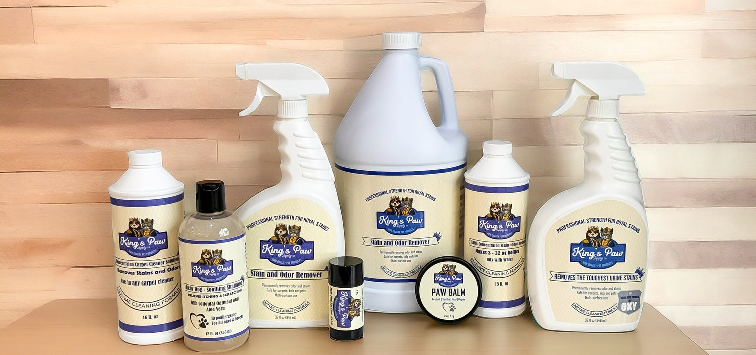 Say goodbye to stubborn pet stains and odors with our professional-grade products! King's Paw Supply Co offers a complete line of specially formulated pet care solutions, from our bestselling Enzyme Cleaner that eliminates pee and vomit stains on contact to soothing paw balms that protect your furry friend's sensitive paws from harsh terrain and weather.